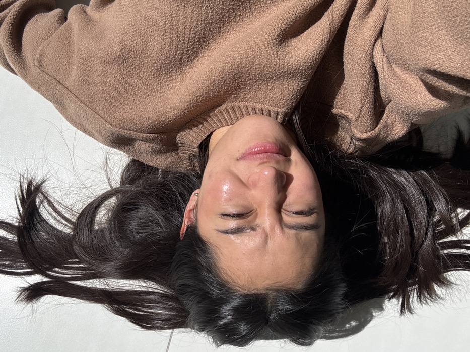 An upside-down close-up shows a woman wearing a tan sweater, lying on a white tiled floor. Her eyes are closed, and she is slightly grimacing. Her dark, glossy hair is spread around her head. The lighting is bright, casting a shadow on the top of her sweater and face. An earring is visible in her left ear.