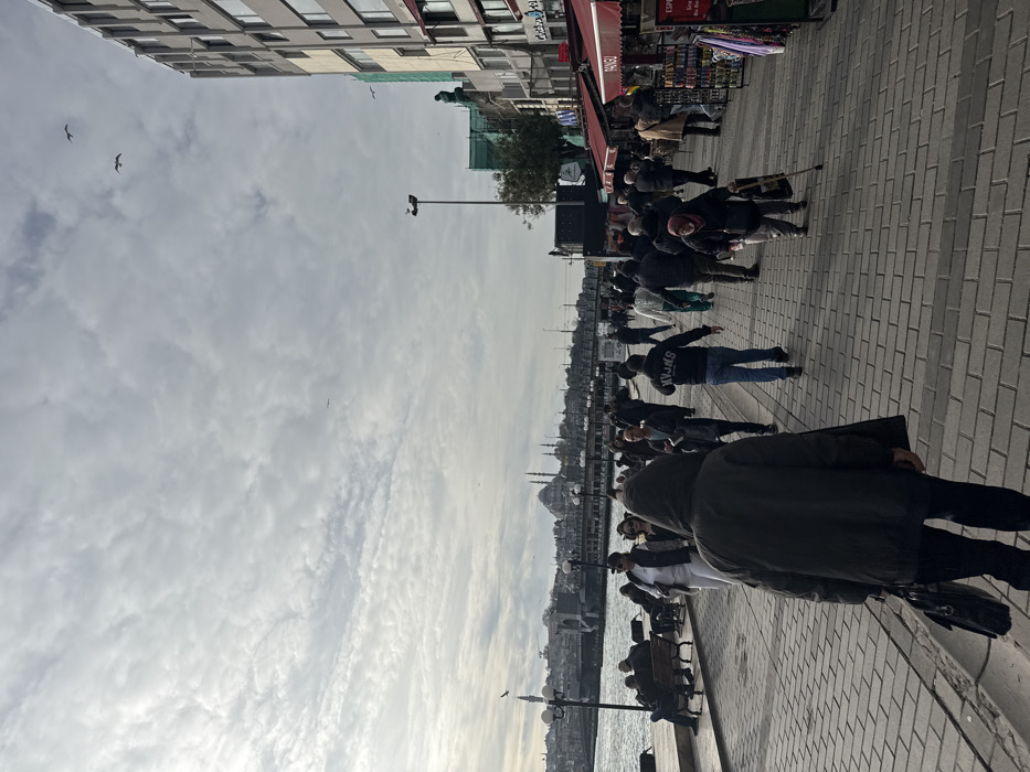 The image portrays a busy waterfront promenade in Beyoğlu, Istanbul, Turkey, under an overcast sky exhibiting altocumulus cloud formations with several gulls in flight