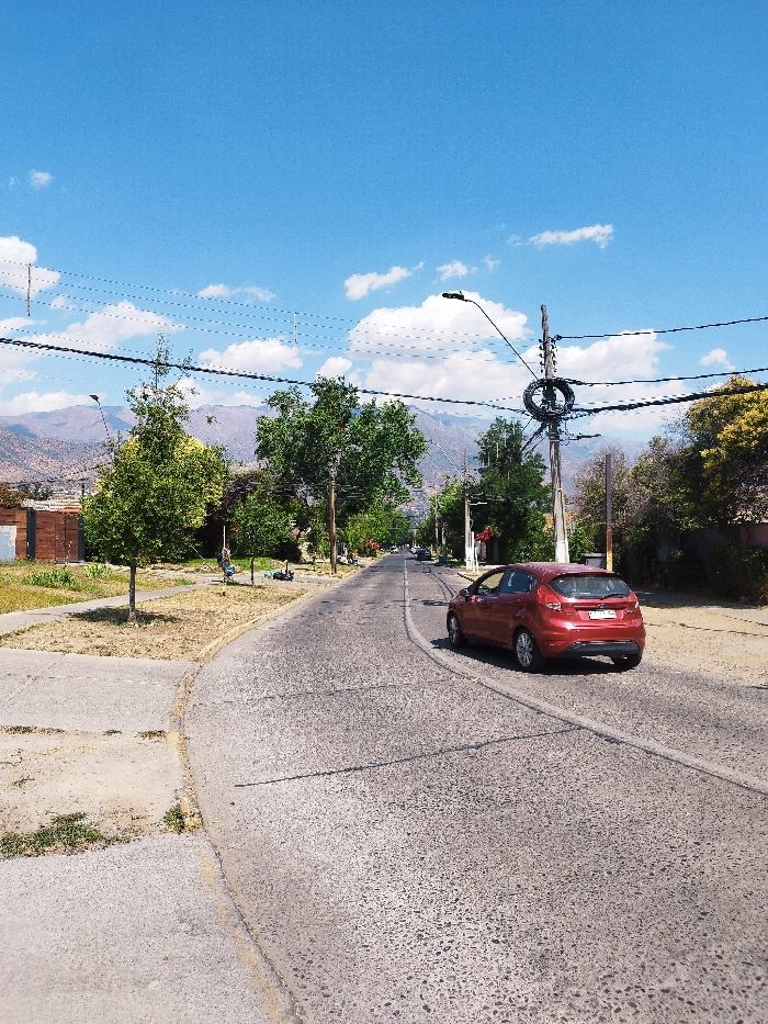 A red compact car drives on a paved road in a residential neighborhood. Trees line the street, and mountains are visible in the distance under a blue sky with scattered clouds. Power lines and utility poles are present. A patch of lawn sits on the left side of the road. The road curves slightly to the left in the distance.