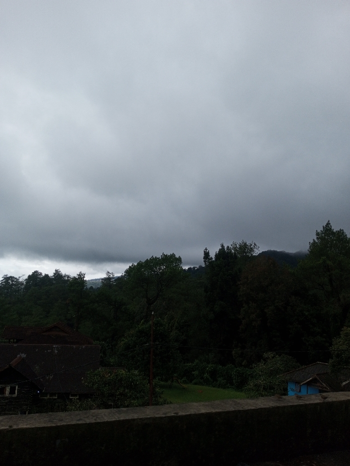 The image captures a panoramic view of a rural, mountainous landscape in Bangtsho, Bhutan, under an entirely overcast sky. The upper two-thirds of the frame are dominated by a heavy expanse of dark grey clouds, providing a dim, diffused natural light to the scene. The midground and background consist of successive layers of densely forested hills and mountains, uniformly covered in dark green foliage, suggesting thick vegetation. The most distant peaks on the horizon appear partially obscured by low-hanging clouds or atmospheric haze, blending into the grey sky. In the midground, a prominent reddish-brown utility pole stands vertically slightly left of center, with a dark horizontal wire extending from it. A small, irregularly shaped patch of vibrant green grass is visible among the trees towards the right side. The foreground is occupied by a dark, weathered concrete or stone wall, running horizontally across the bottom fifth of the image, serving as the immediate vantage point. Behind this wall, two structures are visible. On the left, a dark-roofed building with brown wooden facades and a visible window frame is partially obscured by trees. On the right, a small, distinct building with brightly painted blue walls and a dark roof is situated amidst the greenery. No individuals are present, and no specific actions are depicted within the frame.