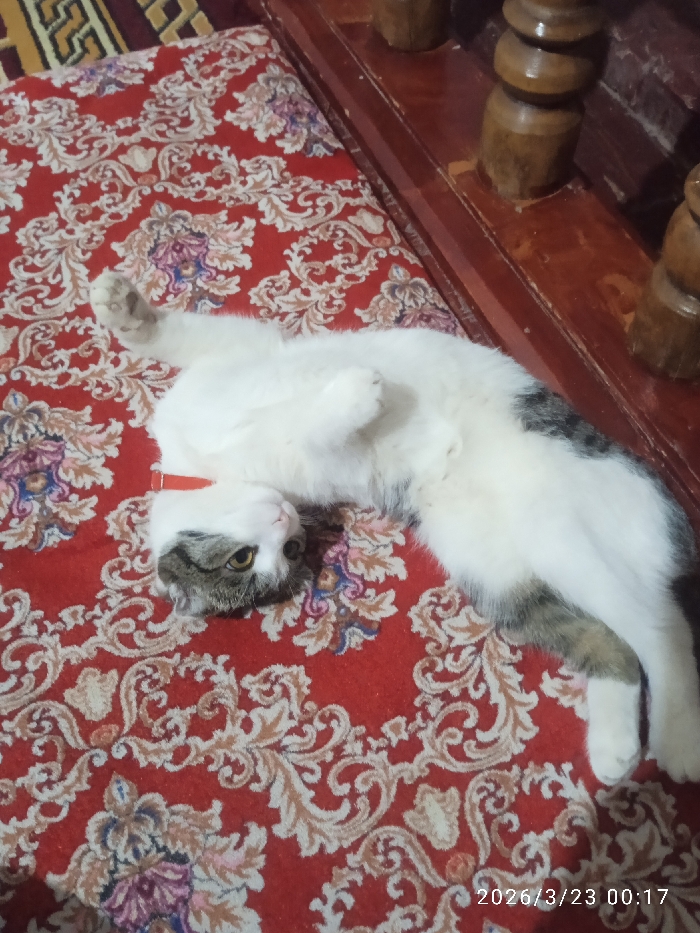 An indoor scene in Khujayli, Uzbekistan, captures a domestic cat lying on its back on a red patterned rug