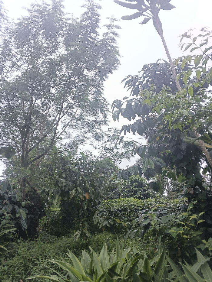 The scene depicts a dense, lush vegetated environment under an overcast, light gray sky. The specific location within the city of Unknown, Vietnam, is not identifiable, but the flora is consistent with a rural or agricultural area. On the left, a tall tree with fine, feathery green leaves extends upwards. To the upper right, a slender plant stem culminates in a cluster of elongated, pale green, pod-like fruits, characteristic of *Theobroma bicolor*. The mid-ground is densely populated by dark green, broad-leafed plants, consistent with coffee cultivation, bearing numerous small green coffee cherries. Some leaves exhibit minor yellow-brown discoloration. The immediate foreground is filled with distinct broad, sword-like green leaves. No individuals, animals, or man-made structures are visible. The overall environment suggests a cultivated tropical setting under muted lighting conditions.