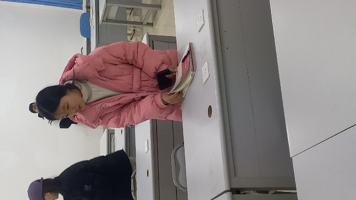 A young girl in a pink puffy jacket sits at a desk, absorbed in reading a book. Her black hair is neatly styled. She holds the book open with both hands, her expression focused. Beside her, a person wearing a black jacket and a purple hat is also seated. The classroom setting includes desks and a glimpse of a blue curtain. A prominent cabinet-like structure with electrical outlets is visible to the right.