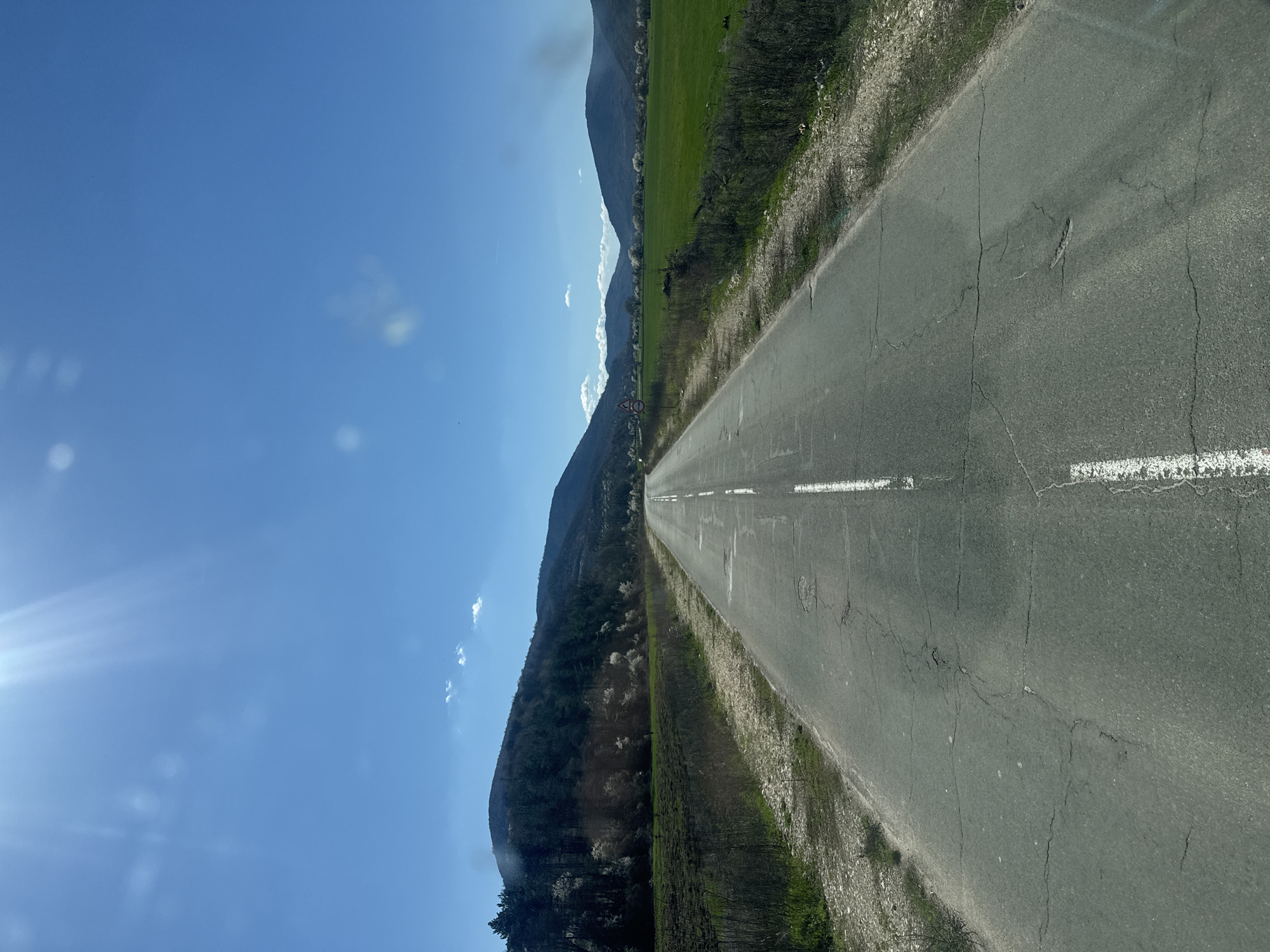 The image depicts a road running through a rural area, likely near Glozhene, Bulgaria, based on the landscape. The road is asphalt, with a center line marking and visible cracks. The landscape on either side of the road consists of grass, foliage, and trees. The background includes hills or small mountains. The sky is clear blue with some scattered clouds. The image has been rotated 90 degrees counterclockwise.