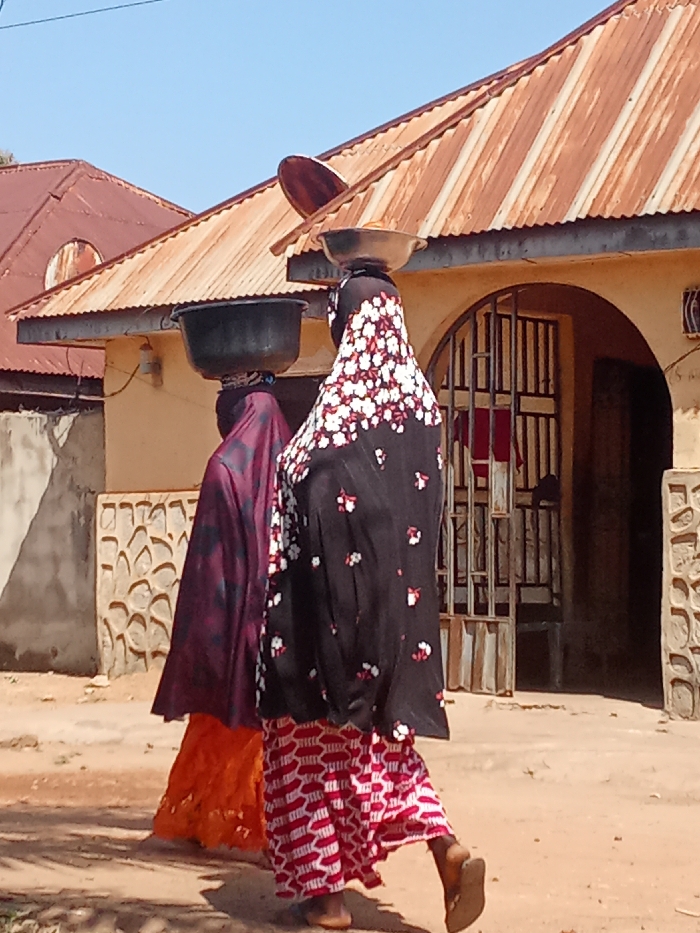 Two individuals are depicted walking on a dry, light-brown earth surface in Akwanga, Nigeria. The figure in the immediate foreground, viewed from behind, wears a black head covering adorned with white and red floral patterns, and a red and white patterned lower garment; her visible right foot is either bare or in a simple sandal. A silver-colored metal bowl is balanced on her head. The second individual, positioned behind and to the left, is also viewed from behind, wearing a dark maroon head covering and an orange lower garment, carrying a large, dark basin on her head. In the background, a single-story building with pale yellow walls, a brown metal gate set within an arched entryway, and a heavily rusted corrugated metal roof is prominent. A textured, light-colored wall section is visible to the right of the gate. A second building with a similarly rusted corrugated roof is partially visible further left. The sky is clear blue, and shadows suggest direct overhead sunlight.