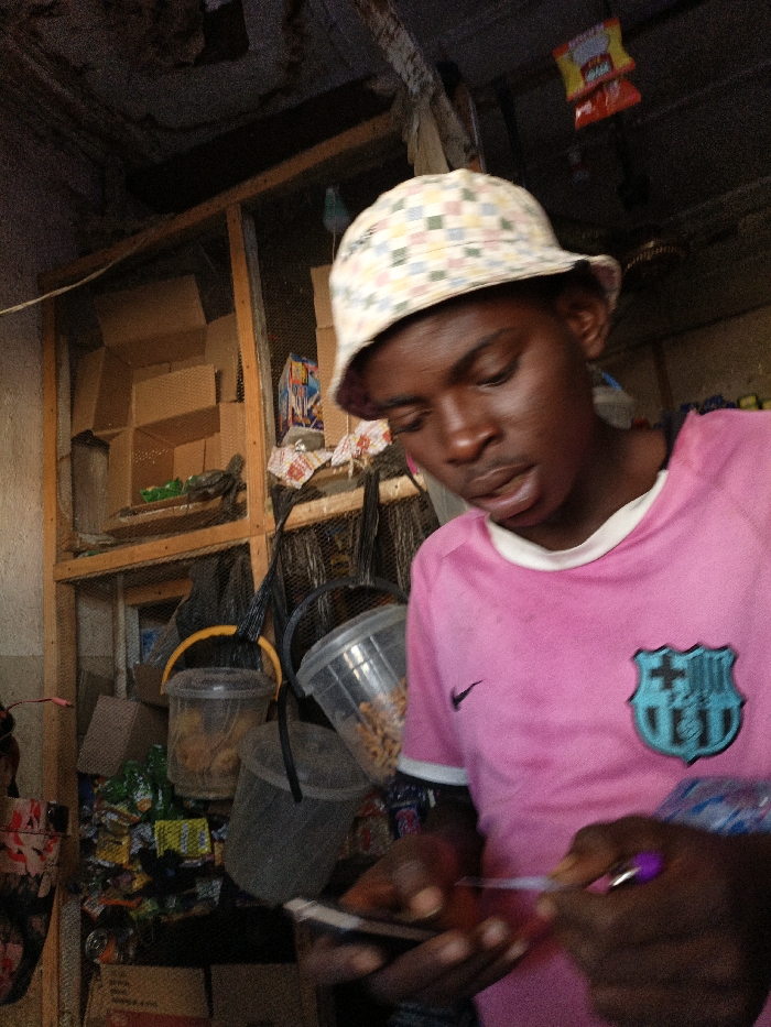 An indoor scene in Gama, Nigeria, depicts a young adult male with dark skin, wearing a checkerboard-patterned bucket hat and a pink short-sleeved t-shirt with a Nike swoosh and an FC Barcelona crest