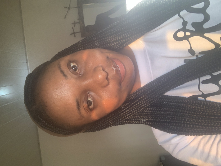 A woman with dark skin and braided hair looks at the camera with a slight smile. She is wearing a white shirt with a black design on the front. Her hair is braided and frames her face. The background appears to be a wall with a window on the left and a decoration on the wall to the right behind her. The picture is slightly rotated.