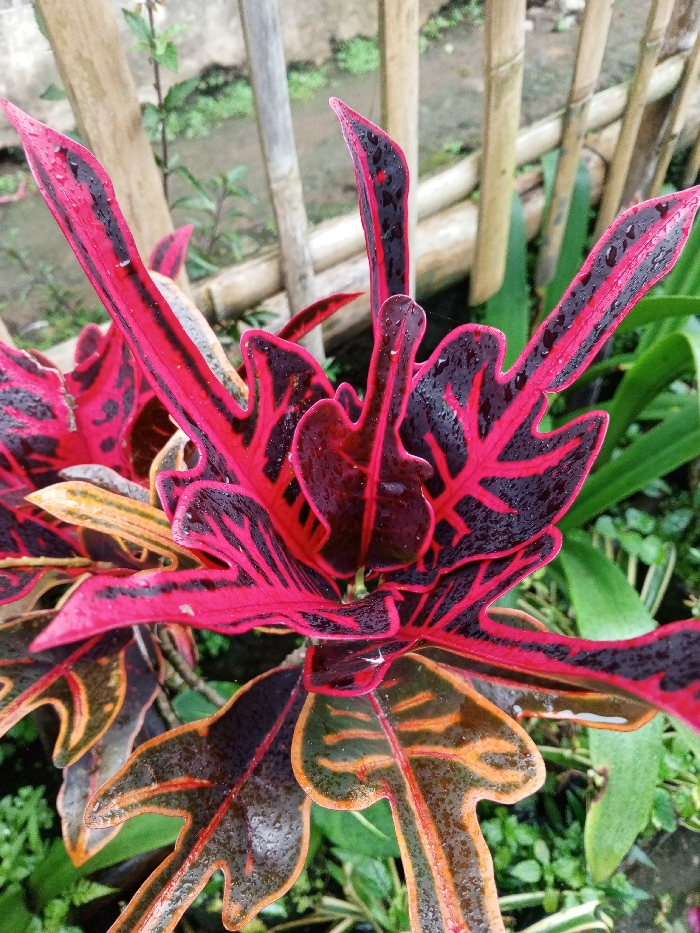 A vibrant Croton plant dominates the foreground. Its leaves exhibit bold red and black patterns, some with orange hues and intricate venation. Water droplets glisten on the leaf surfaces. The plant is surrounded by small green plants and blades of grass. A light-colored bamboo fence serves as a blurred background, adding depth to the composition.
