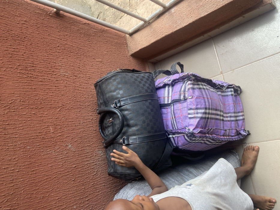 The scene is located in Oba-Aboji, Nigeria. A young child, possibly male, wearing a light-colored sleeveless top with a star graphic, stands barefoot on light-tiled flooring. The child's right hand is placed flat on a black duffel bag with a dark checkered pattern, equipped with top handles and a zipper. This duffel bag rests on a larger, purple plaid-patterned backpack made of woven material, which shows visible wear and fraying. Both bags are positioned against a reddish-brown, heavily textured wall. A light-colored metal railing with vertical bars is visible on the right, and a portion of a grey, fabric-covered object is present to the child's left.