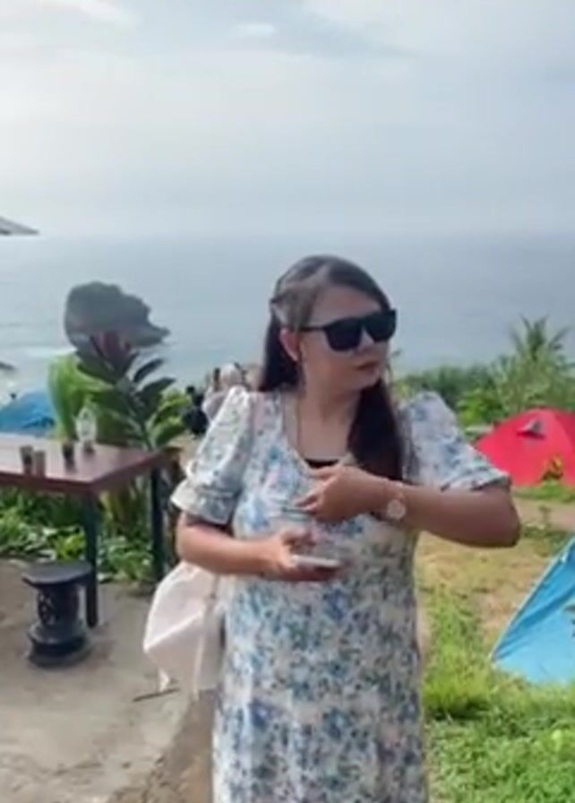 The video opens with a woman in a blue and white floral dress and sunglasses standing on a concrete patio, looking away from the camera and adjusting her hair. She holds a phone in her hand. Behind her is a view of the ocean with rock formations jutting out of the water. To the left, there's a dark wooden table with several small glass jars on it, topped with black stools. A large umbrella provides shade. To the right, there are several colorful tents pitched on a grassy area. The camera then shifts to a wider shot, revealing another woman taking photos of the ocean view. The focus moves to the table and the ocean backdrop. The tents are visible on the periphery. The sky is overcast with white clouds. Palm trees and other greenery dot the landscape.