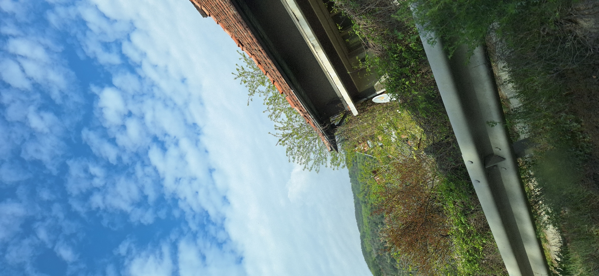 roadside scene in Kresna, Bulgaria. The sky is blue with scattered white clouds. In the foreground is a grey metal guardrail, alongside overgrown foliage and bushes. A building with a red-tiled roof and a grey overhanging structure is visible. There are some trees near the building. In the background, there appears to be a green hill. The presence of a satellite dish is also noted on the side of the building. The photograph seems to be taken from inside a vehicle, likely a car, looking upwards and out of the passenger side window.