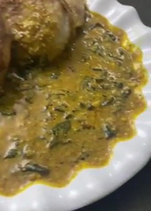 plate of food. There are three round, slightly browned, pancake-like objects stacked together on a white plate. The pancakes rest on a yellowish-brown sauce with green leafy vegetables mixed in. The plate has a ruffled edge. The background is blurred.