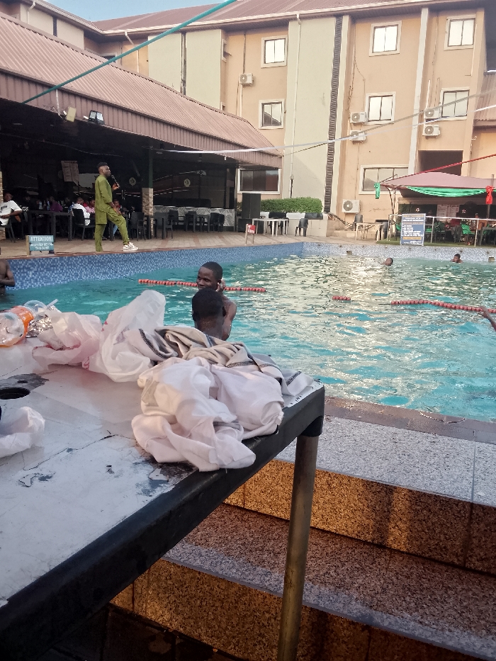 The image depicts an outdoor swimming pool area, characteristic of a hotel or resort, situated in the city of Onitsha, Nigeria