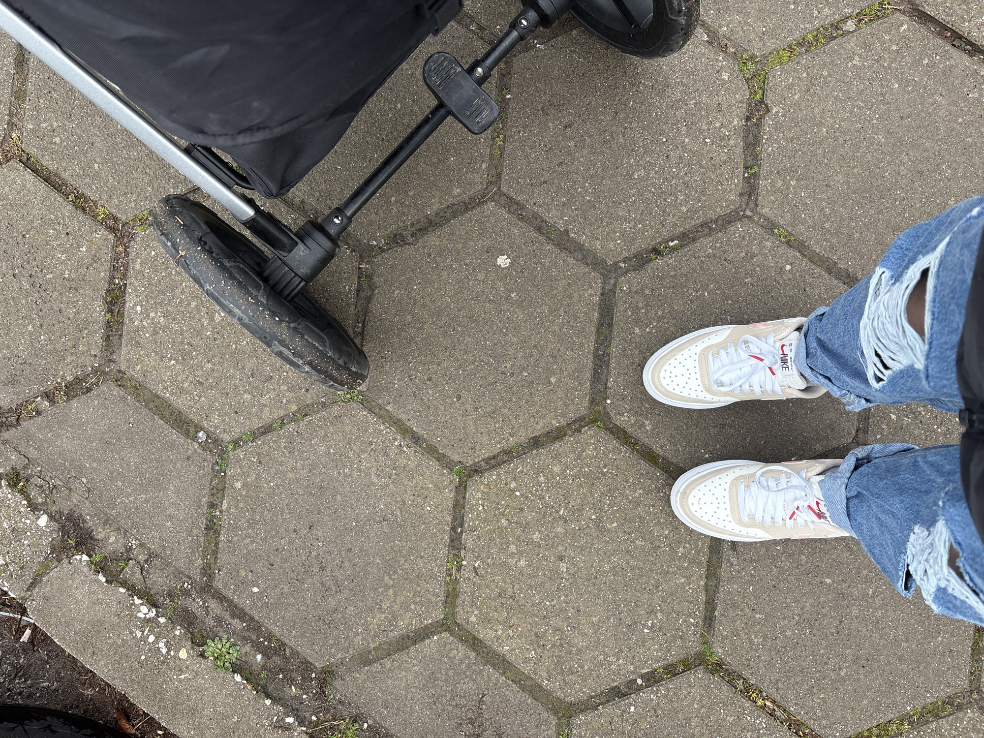An overhead view captures a paved outdoor surface in Pernik, Bulgaria. The ground is composed of hexagonal grey concrete paving blocks, with moss and small weeds growing in the seams between them. Dirt and small white debris are scattered on the surface and within the cracks. In the bottom-left quadrant, the lower legs and feet of an individual are visible. This individual wears light blue denim jeans, significantly ripped on the thighs. Their footwear consists of white and beige Nike brand athletic shoes, featuring visible red stitching accents near the laces. In the upper-right quadrant, the front portion of a black baby stroller is present. It has a silver-colored metal frame, black fabric elements, and black plastic wheels. The visible front wheel appears soiled with dirt and debris. A black footrest or brake mechanism is also discernible on the stroller's lower frame. The individual appears to be standing next to the stroller.