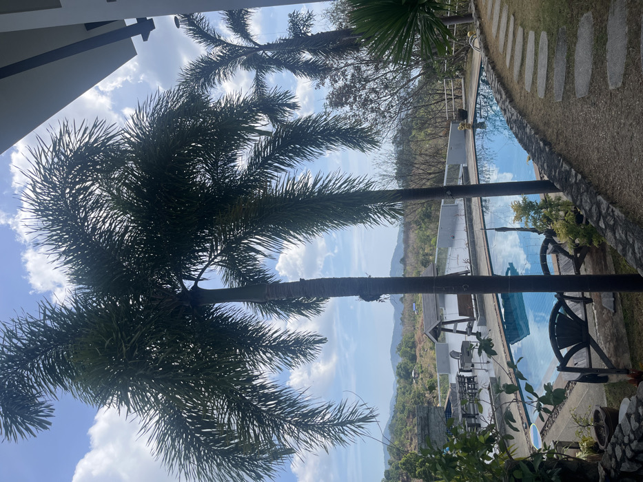 A sideways view showcases palm trees against a sky with scattered clouds. A swimming pool stretches along the right side, flanked by a stone path. In the distance, a mountainous landscape is visible. An outdoor seating area with chairs and tables is nestled among greenery. The overall scene conveys a tropical or resort setting.