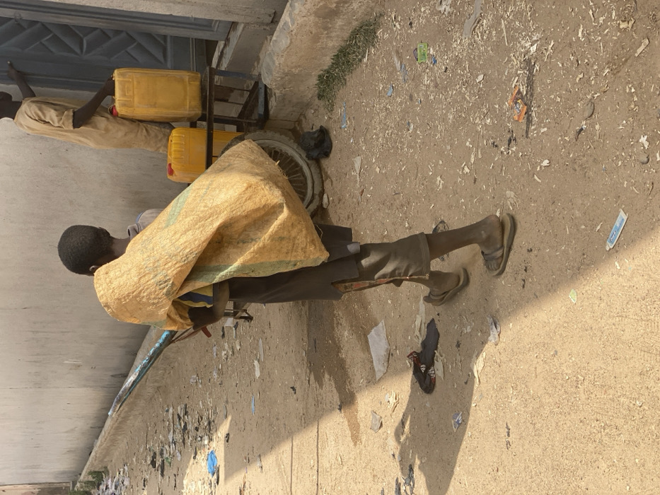 The scene depicts an unpaved, debris-strewn alleyway in Dabawa, Nigeria, illuminated by harsh sunlight that casts distinct shadows. In the foreground, a young male, observed from the rear, walks towards the right side of the frame. He has dark skin, wears dark shorts, a partially visible light-colored top, and open-toed sandals. He carries a large, light-tan woven sack over his left shoulder and across his back. In the midground, to the right, a second young male with dark skin, dressed in a light-brown long-sleeved garment, stands facing and appearing to interact with a light-blue door set into a light-colored building wall. Adjacent to this individual, a two-wheeled metal cart holds two large yellow plastic jerrycans and one smaller yellow jerrycan. The ground consists of dry dirt extensively covered with various litter, including plastic bags, paper fragments, wood shavings, and fabric items. A plain, light-colored wall defines the left boundary of the alley.