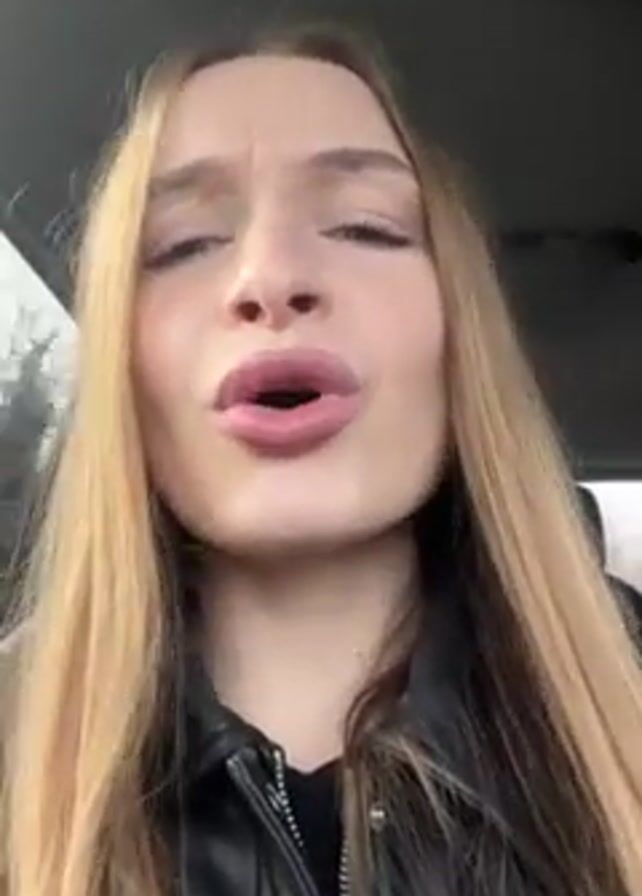 A young woman with long blonde and brown hair, wearing a black leather jacket, is in a car. She is looking at the camera and talking. The camera is focused on her face, and the background is blurry. Through the window, trees are visible.