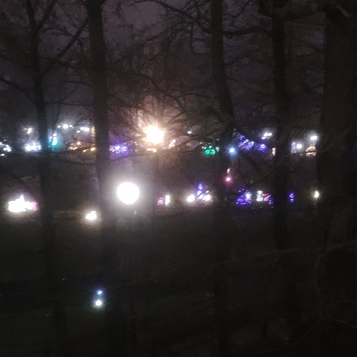 A dark, blurred image captures a night scene with trees silhouetted in the foreground. Beyond, a collection of illuminated lights creates a festival or park atmosphere. Soft, glowing orbs and string lights in various colors punctuate the darkness. A central, brighter light source dominates, obscuring details. The image suggests an outdoor event at night, viewed through a veil of darkness or mist.
