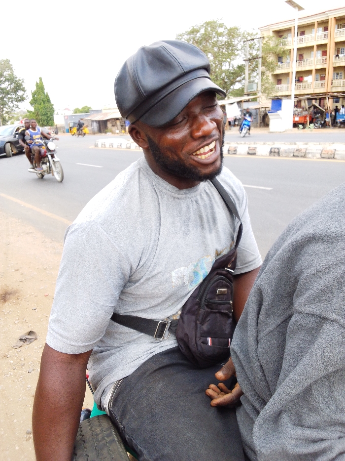 An outdoor scene in Adankolo, Nigeria, depicts a daytime street environment. In the immediate foreground, an adult male with dark skin and a short beard is positioned facing slightly left, smiling broadly with his eyes partially closed. He wears a black, leather-like newsboy cap, a light grey short-sleeved t-shirt with a faint graphic, and dark jeans. A black sling bag with a silver buckle and red/white stripe detail is strapped across his chest. Sweat is visible on his forehead and upper face. He is seated on what appears to be a motorcycle or scooter, with a portion of a black tire visible beneath his right arm. To his immediate right, a form covered in grey fabric is partially visible, suggesting another person or object. In the background, a paved road with a broken white center line and a concrete median extends horizontally. On the far left lane, a black car is present, followed by a motorcycle carrying two young male passengers in a light blue and a dark shirt, respectively, moving from left to right. Further down the road, a light blue motorcycle is also visible. The roadside to the left of the road is unpaved dirt. Across the road, multiple structures line the street, including a multi-story building with balconies in a light brown hue, and other smaller, single-story buildings. Trees and sparse vegetation are present throughout the background. The sky is bright and overcast or washed out by light.