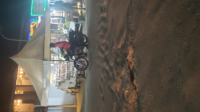 A nighttime street scene features a motorcycle parked beside a roadside stand