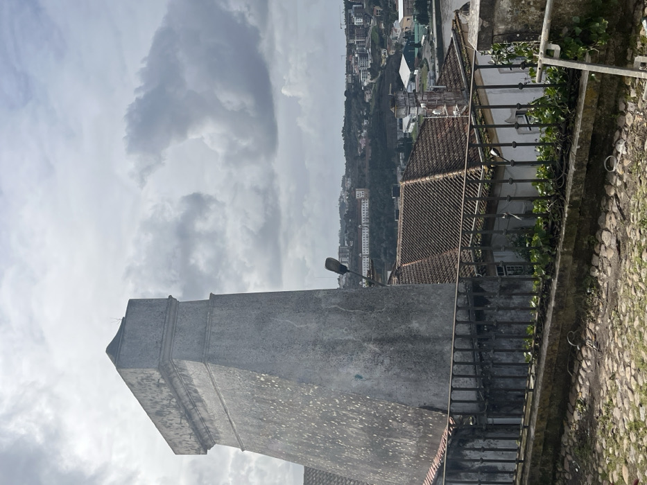 The image presents an elevated, static view of a portion of Coimbra, Portugal, under a predominantly overcast sky. In the immediate foreground, a weathered, rectangular stone pillar, exhibiting significant grey and green staining from age and environmental exposure, stands prominently on the left. The pillar tapers slightly towards a flat, minimally decorated cap. A dark, ornate wrought-iron railing with vertical bars spans the mid-foreground, set atop a stone ledge. Below this railing, a cobblestone surface, uneven and showing signs of sparse green vegetation and debris, constitutes the ground level. Immediately behind the railing, a lower wall or parapet supports a strip of vibrant green, vine-like foliage. Beyond the railing and foliage, a cluster of traditional buildings with distinctive terracotta-tiled roofs and light-colored walls descends the slope. A black street lamp, featuring a curved arm and an elongated lamp housing, extends upwards from behind the large stone pillar, positioned above the rooftops. The background unfolds into a panoramic cityscape. Various structures are visible across undulating green hillsides, including a prominent, elongated, multi-story building on a distant slope. Towards the right, a body of water, identifiable as the Mondego River, is partially visible, bordered by some flat land containing what appear to be light industrial or recreational facilities. The sky is filled with voluminous grey clouds, suggesting a cloudy day. There are no individuals, animate subjects, or discernible actions depicted in the scene. The perspective suggests the photograph was taken from an elevated point within Coimbra's historic upper town, looking towards the lower city and the river.