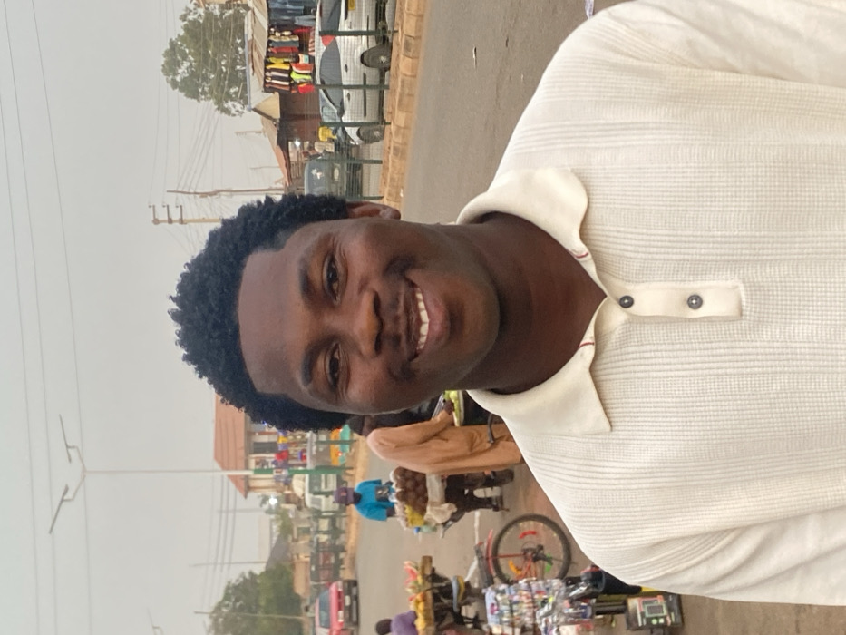 A smiling young man with dark hair is centered. He wears a light-colored collared shirt with two buttons undone. The background shows an outdoor scene with a street and various objects. A building is visible in the distance, along with cars, electrical poles, and vendors with carts. The image has a slightly hazy or overcast quality.