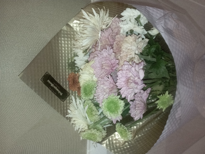 The image displays a bouquet of flowers presented in a close-up, top-down perspective within an indoor setting in Batulawang, Indonesia