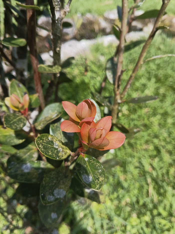 - "A close-up shows a shrub with vibrant new growth of reddish-orange leaves contrasted against older, dark green foliage" by FM-VDTjj2, licensed under CC BY 4.0