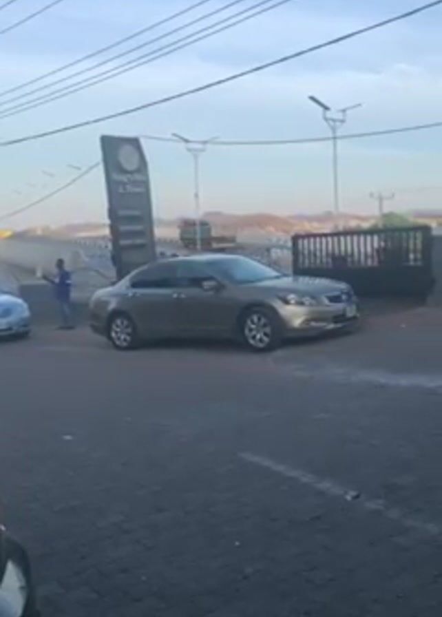static shot of a street scene. A light-colored Honda Accord is parked near a sign for "King's Bite J. Town" restaurant. A man in a blue shirt and dark pants walks in front of the car. Other cars are parked nearby. The road is paved with interlocking pavers. Power lines are visible overhead. In the background, there's a bridge or overpass with traffic, and a distant mountain range. The sky is a clear, pale blue.