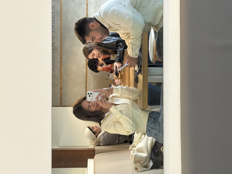 A vertical shot shows a mirror reflecting several people in a store. A woman takes a selfie with her phone, while others are visible behind her, including a man in a cream-colored shirt and a woman in a black jacket. Seating is visible, with a person appearing to be resting. The mirror's frame is visible on the edges.