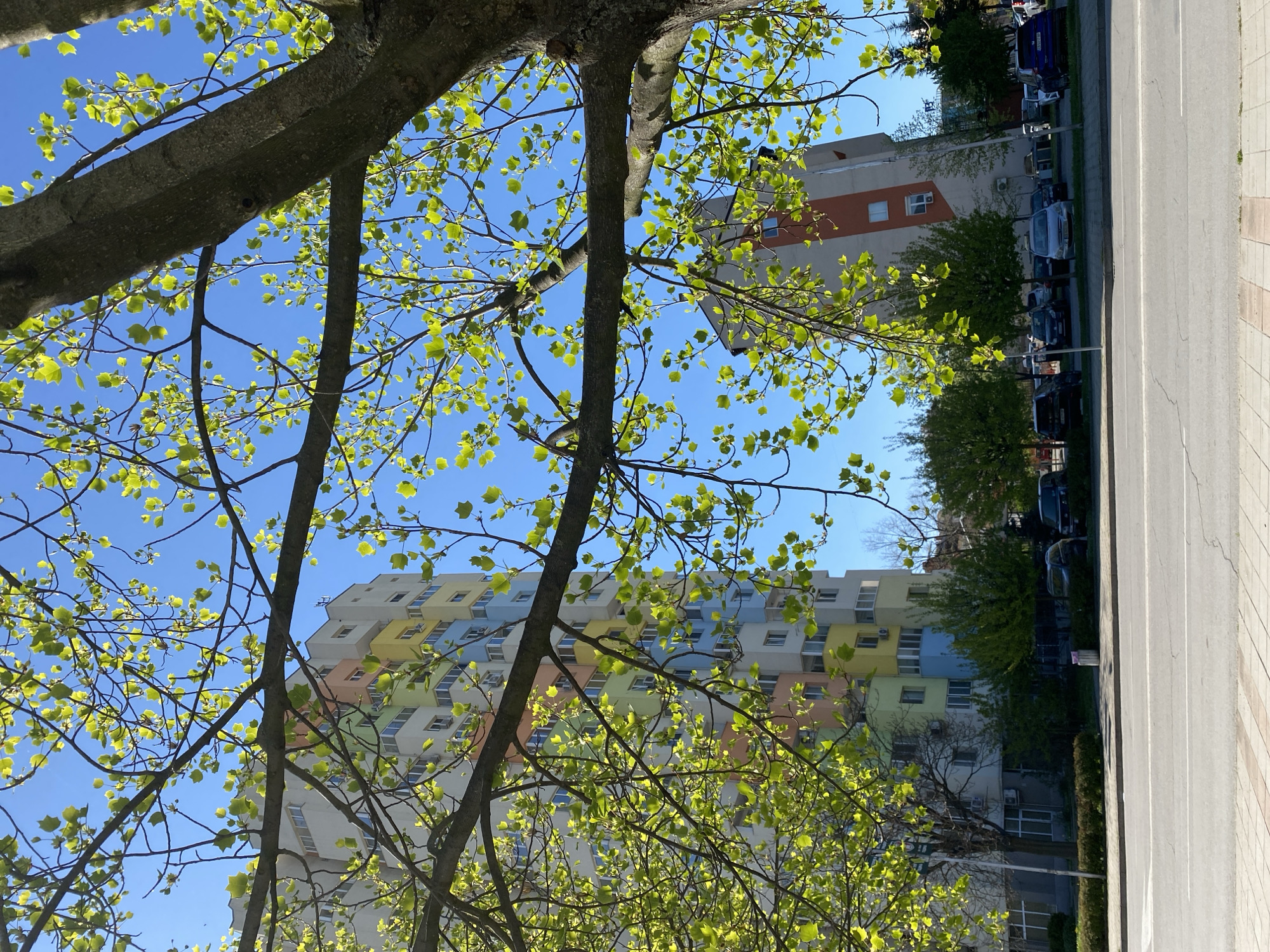 view upwards through the branches of a tree with young green leaves, towards two buildings and a street. The sky is blue and cloudless. One building is a high-rise block of apartments, painted with various pastel colors. The second building is plainer in design and colored brown and beige. A street runs vertically along the right side of the image, showing parked cars. The location is Gabrovo, Bulgaria.