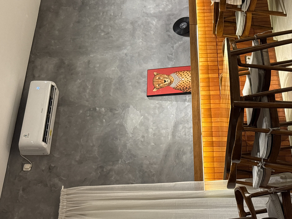 The image displays an unoccupied interior space in Patrang, Indonesia, characterized by a contemporary aesthetic. A textured grey wall, resembling polished concrete, forms the backdrop. Mounted on the upper left portion of this wall is a white GREE air conditioner unit, featuring a digital display showing "23" in blue. To the far left, white, semi-transparent curtains hang from a rod. Horizontally bisecting the mid-section of the wall is a dark brown wooden shelf. Below this shelf, a warm orange light strip illuminates a panel composed of small, rectangular orange-brown tiles arranged vertically. On the wooden shelf, a rectangular artwork depicts a cheetah wearing a prominent pearl necklace against a red background. To the right of this artwork, a black vinyl record leans upright. In the foreground, multiple dark brown wooden tables with matching chairs are arranged. Each chair is fitted with a light grey cushion secured with ties. No individuals, actions, or interactions are present in the scene.