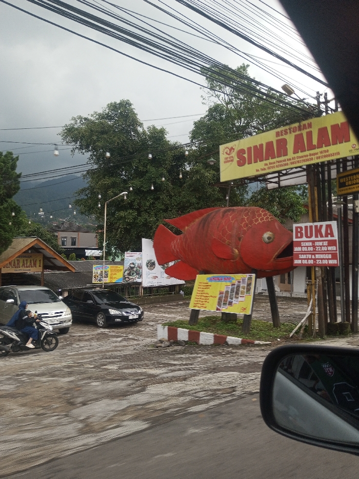 This image depicts a commercial roadside area identified as Cisarua-Bogor, West Java, Indonesia, based on visible signage detailing a local address and the "WIB" (Waktu Indonesia Barat) time zone indicator. The scene is observed under an overcast sky, with numerous utility lines strung across the upper frame. The central feature is a large, three-dimensional sculpture of a red fish with prominent scales and an open mouth, mounted on two dark support poles. This sculpture is positioned in front of a yellow sign displaying "RESTORAN SINAR ALAM" in red lettering, along with contact details and a "Western Union" logo. To the right of the fish, a white sign lists the restaurant's operating hours in Indonesian. A smaller yellow sign showcasing food items is situated on a post in front of the fish sculpture, near a red and white striped curb segment. Multiple larger billboards are visible behind the fish, partially obscured by dense green foliage. To the left, a light-colored multi-purpose vehicle is parked, with a dark-colored sedan parked behind it. In the foreground, a person wearing a blue jacket and a dark head covering is seated on a white and black scooter/motorcycle. Further to the left, a building with a dark roof and a sign reading "SINAR ALAM 1" is visible. The environment includes abundant green trees, some adorned with decorative string lights, and distant mountains are visible under the cloudy sky. The ground surface is paved, showing irregular patterns, possibly from wear or moisture. A vehicle's side mirror is partially visible in the bottom right corner of the frame.