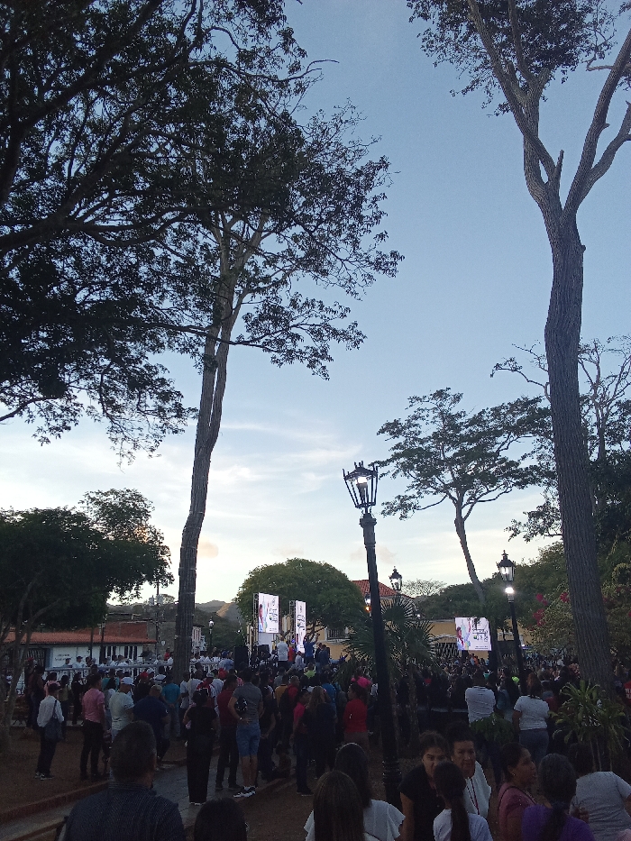 The image depicts a large outdoor public gathering at dusk within a city plaza or park in La Asunción, Venezuela