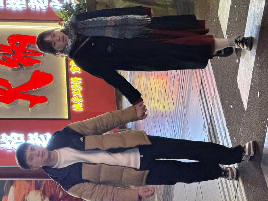 Two individuals, a male and a female, walk hand-in-hand on a paved street at night in Yuzhong District, China. The male, positioned on the left, wears a two-tone beige and black puffer jacket over a white crew-neck sweater, black trousers, and brown and white athletic shoes. He has short dark hair and faces forward. The female, on the right, is dressed in a long black coat, a maroon dress or skirt, a multi-patterned blue and grey scarf with fringe, light-colored socks, and black Mary Jane-style shoes. Her head is slightly lowered, and her mouth is slightly open. Their right hands are clasped as they walk. The background is dominated by a brightly lit red building facade featuring large Chinese characters for '火锅' (Hotpot) and smaller orange characters reading '纯手工炒料' (Purely handmade stir-fried ingredients), indicating a restaurant. The street surface exhibits reflective patches of red, yellow, and blue light, and includes white painted lines and tactile strips commonly found in pedestrian areas.