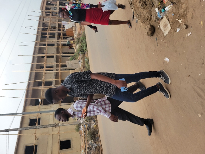 The image depicts three young adults walking on an unpaved dirt shoulder adjacent to an asphalt road in Awka, Nigeria