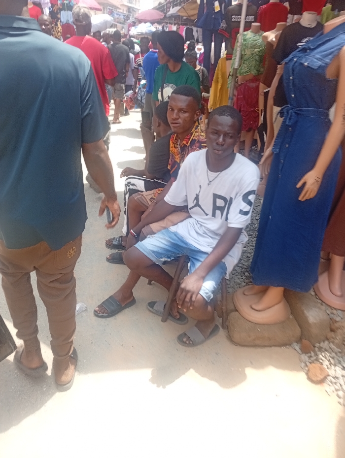 The image depicts a crowded outdoor market scene in Fegge, Nigeria, observed from a low-angle perspective. In the immediate foreground, the back of an individual wearing a dark blue short-sleeved shirt and brown cargo pants is visible, facing away from the camera, with a dark object (possibly a mobile phone) held in their right hand. In the midground, three males are seated on low stools or makeshift seats along the right side of the frame. The leftmost seated male wears a black t-shirt and dark shorts with white side stripes, partially obscured. The middle seated male wears a multi-colored patterned short-sleeved shirt, dark shorts, and black slide sandals, looking slightly to the left. The rightmost seated male, positioned closest to the viewer, wears a white t-shirt with a black "JORDANS" logo, light blue distressed denim shorts, and grey slide sandals, looking directly forward. To the right of the seated individuals, several clothing mannequins are displayed. A prominent mannequin, dressed in a long blue denim button-down dress with a tie-waist, stands on a light brown base supported by reddish-brown bricks. Other mannequins in the background display various garments, including t-shirts, dresses, and shorts in multiple colors. The background shows numerous individuals walking amidst densely packed market stalls, indicated by various displayed clothing items, overhead tarpaulins, and structures. The ground appears to be a mix of light-colored compacted dirt or concrete. The scene is brightly lit, suggesting daylight conditions, with shadows cast on the ground.