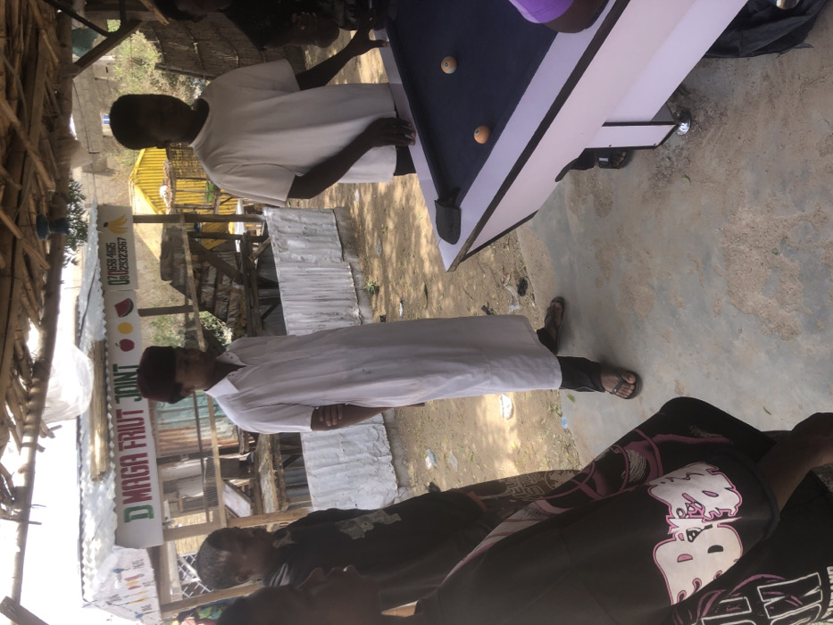 The image captures an outdoor scene in Dabawa, Nigeria, featuring five young males under a rudimentary shelter made of wooden poles and branches. In the foreground to the right, a white-framed pool table with a dark blue felt surface is present, displaying two orange-striped pool balls. A male in a white t-shirt and dark trousers stands with his hands resting on the table, facing left. To his left, another male wearing a long white tunic, dark trousers, a maroon cap, and flip-flops stands with his arms clasped behind his back, observing the table. To the far left, parts of three other males are visible; one in a black graphic t-shirt is partially seen from behind, and two others are partially visible to his left, seemingly observing the activity around the pool table. The ground consists of a concrete slab in the immediate foreground and a dirt/sandy area with scattered debris further back. In the background, a structure with corrugated metal walls and roof is visible, bearing a sign that reads "D MAGA FRIUT JOINT" (sic) with illustrations of an apple, watermelon, bananas, and two phone numbers (0706584165, 0802932567). Beyond this structure, a yellow corrugated metal building is partially visible.
