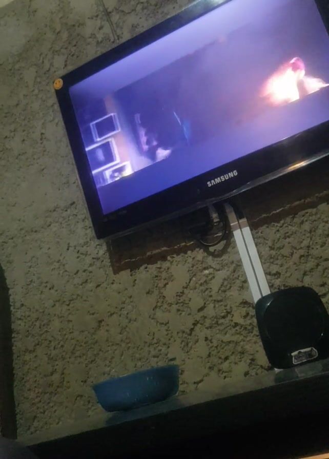 A Samsung flat screen TV is mounted on a textured, beige-colored wall. The TV is playing a video that shows a person with red hair and a black outfit. The person makes a peace sign with their fingers at one point. The video also shows a room with square frames. There is a black object mounted to the wall above the TV and a blue object to the right of the TV. To the right of the blue object, there is a dark, vertical structure, possibly a cabinet. The camera is positioned at a low angle, looking up at the wall.