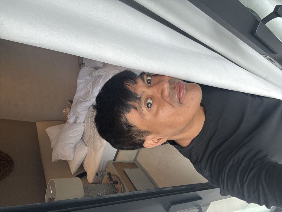 An eye-level shot of a man with dark hair, wearing a black long-sleeved shirt, looking directly at the camera. Behind him, a bright white curtain is partially visible. The background reveals a glimpse of a cluttered bedroom: an unmade bed with white linens, a bedside table with a lamp, and a section of carpet. The picture is likely taken through a window or a glass door.