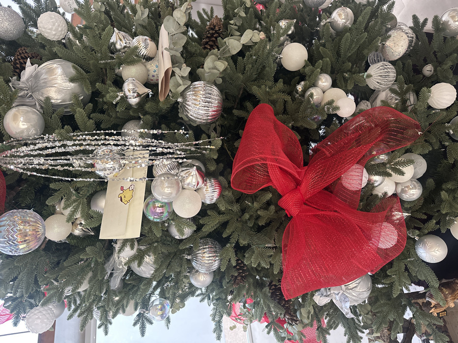 A decorated Christmas tree features silver and white ornaments interspersed throughout its green branches. A large, red mesh ribbon is prominently displayed. A string of silver garland adds sparkle. A beige tag with a cartoon character is hanging on the left side of the tree, near a cluster of ornaments. The tree is adorned with pine cones and eucalyptus.