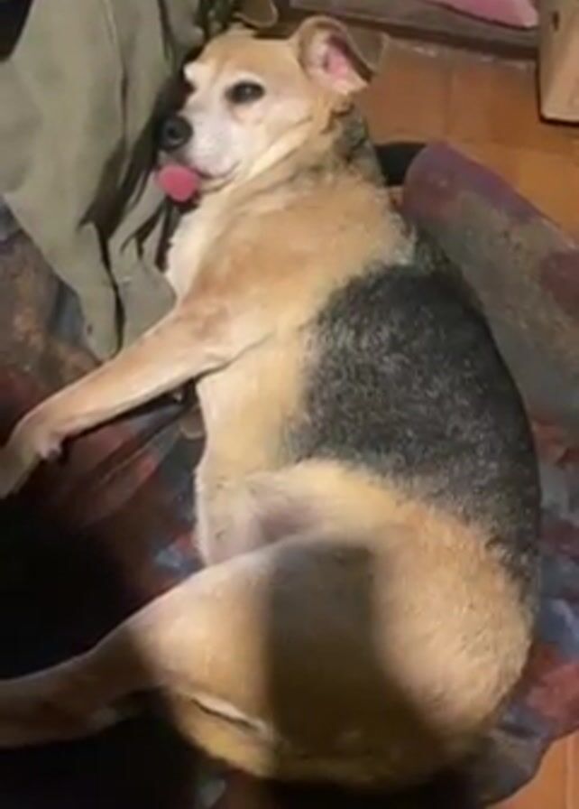 A medium shot shows a dog lying on its side on a patterned blanket, panting with its tongue sticking out. The dog has tan fur on its front and underbelly and a large patch of black fur on its back. The dog is resting its head and front legs on a green piece of clothing. The floor is tiled. The background is blurry, but there is a piece of furniture, a pink towel, and a box in the periphery. In the background, someone is speaking in a foreign language.