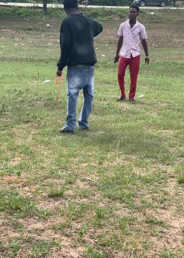 Two young men are in a grassy field on an overcast day. One, with his back to the camera, wears a black long-sleeved shirt and blue jeans, holding an orange string-like object. The other man is facing forward, wearing a white patterned button-down shirt and red pants. He jumps into the air with arms outstretched, laughing. The background shows a road with trees, light posts, and a couple of cars.