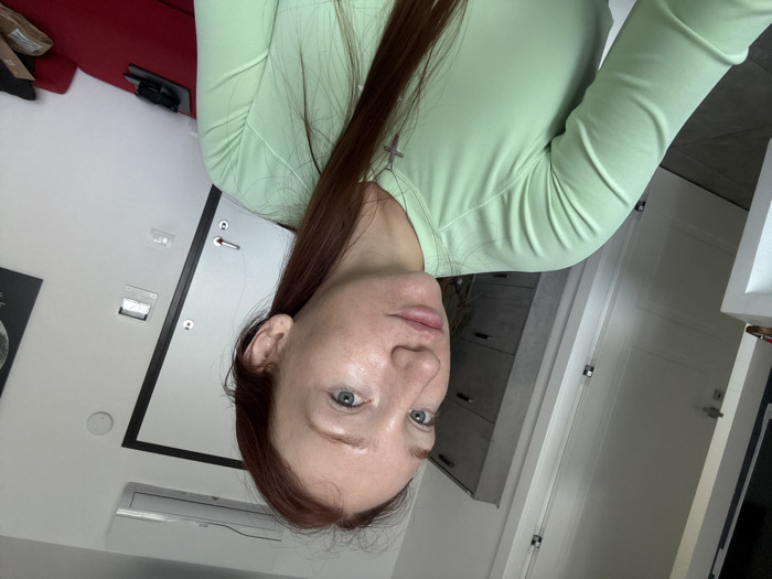 A female subject with long, reddish-brown hair and light blue eyes is depicted in a close-up, selfie-style shot