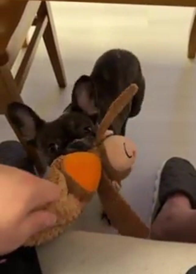 A short video shows a person wearing dark gray slippers on a white floor, holding a plush toy shaped like an animal with a brown, textured body and a smiling face with closed eyes. A black and brown French bulldog puppy is standing on the floor looking at the toy and the person holding it. The dog's ears are perked up, and it seems to be focused on the toy. A table leg is visible in the background. The person seems to be teasing the dog with the toy.