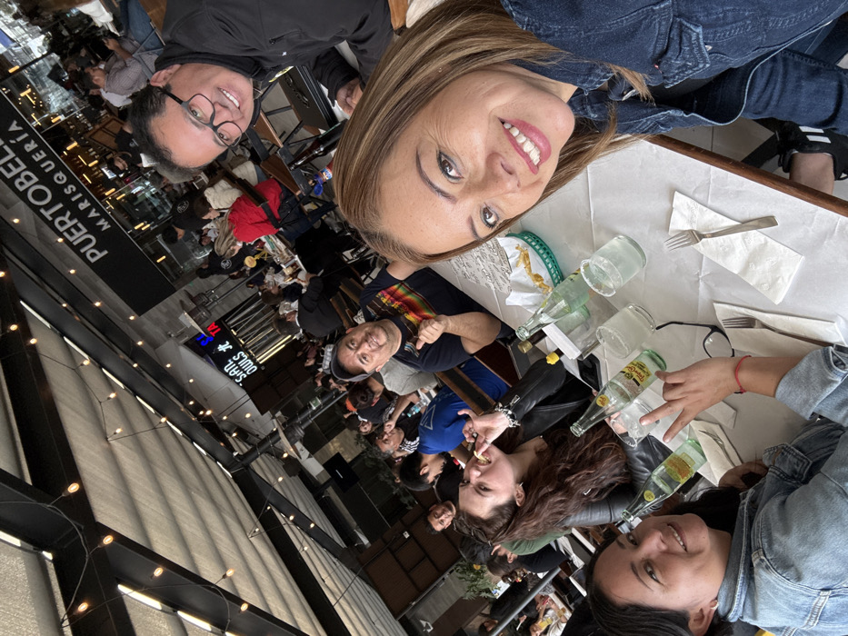A group of friends are gathered around a table in a restaurant, smiling and enjoying each other's company