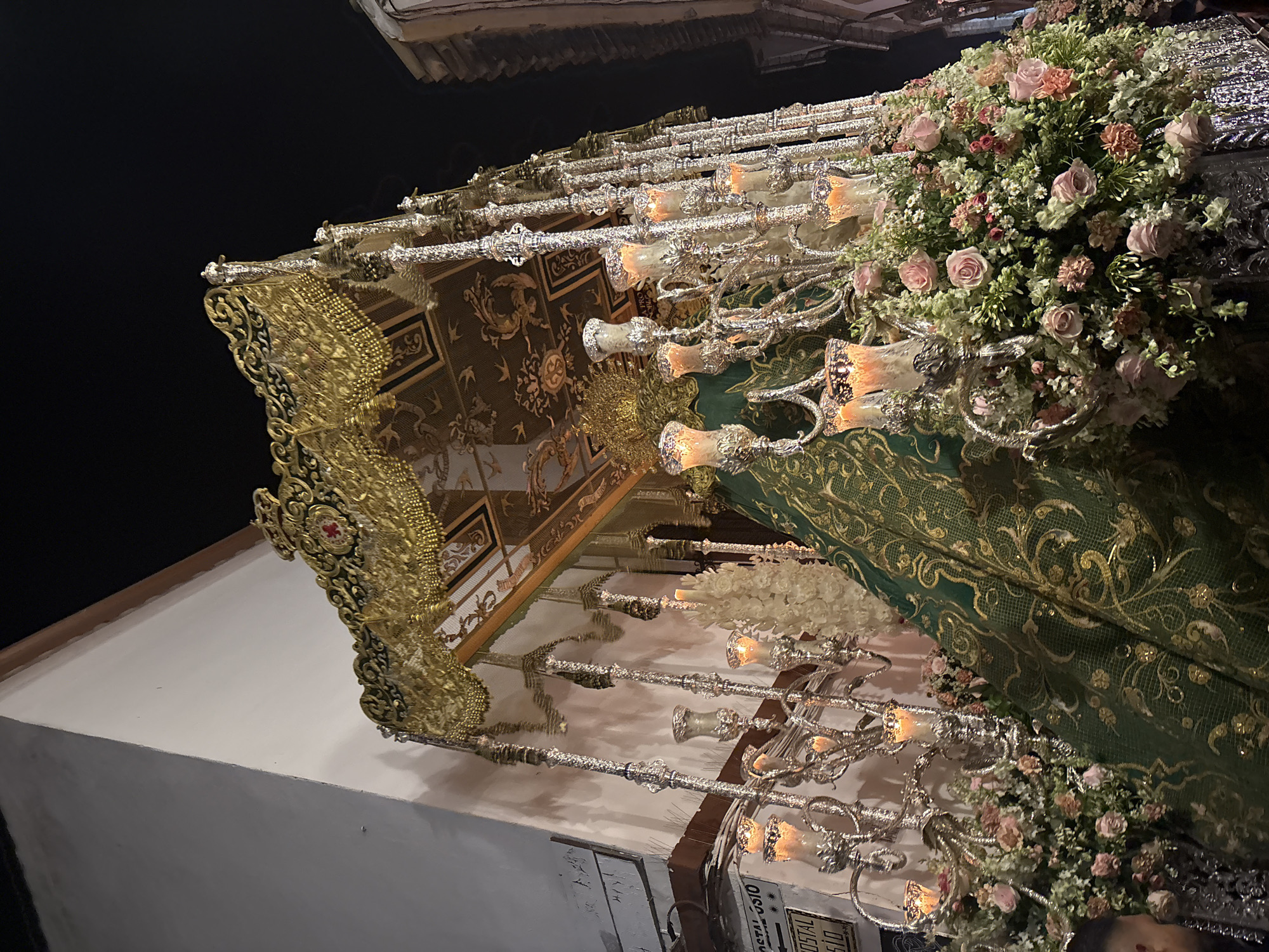 The image depicts a religious procession float in Córdoba, Spain. The float features an ornate gold-trimmed canopy with a green velvet skirt adorned with gold embroidery. Silver candelabras with lit candles are visible. Bouquets of pink and white roses and other flowers decorate the float. A building is partially visible on the left side, with darkness above.