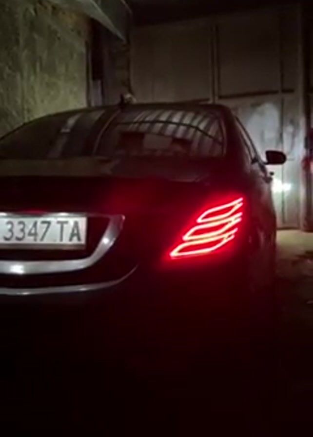 A black Mercedes-Benz sedan sits in a garage with its tail lights illuminated. The car's license plate reads "X 3347 TA". The garage is dimly lit, with a metal roller door visible in the background. The walls are made of brick or concrete. The camera is stationary, capturing the rear view of the car. The focus is on the car's tail lights. The engine appears to be running, judging from the sound.