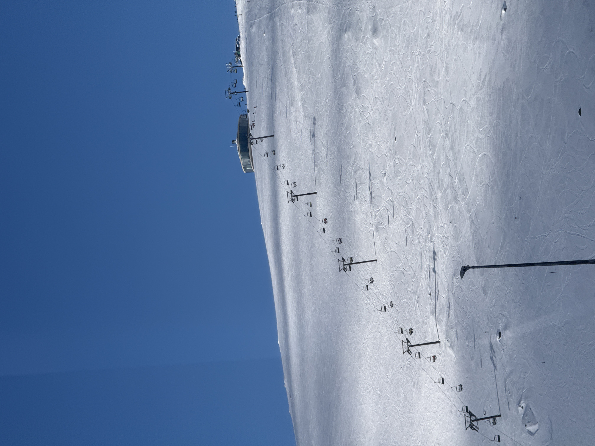 The image captures a snowy mountainside under a clear blue sky