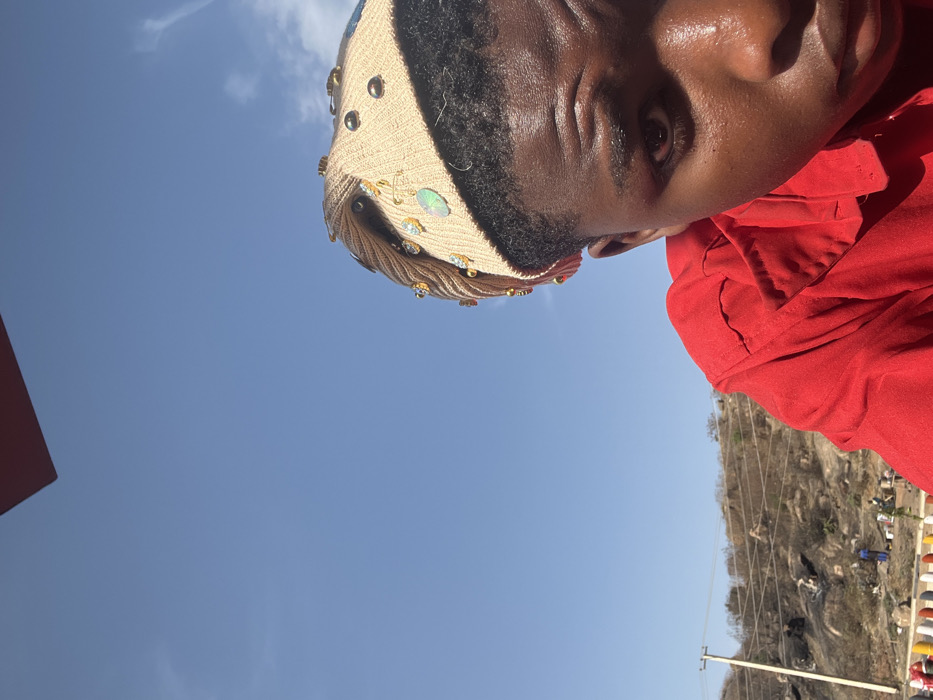 The image displays a close-up, low-angle perspective of an individual positioned in the bottom right quadrant. The person, with dark skin, wears a red collared shirt and a light-colored, possibly beige, knitted cap adorned with gold-toned studs and various reflective ornaments, including faceted gems and an iridescent, tear-drop shaped element. The subject's right eye, part of the forehead, nose, and mouth are visible, with their gaze directed towards the camera. Their skin appears somewhat glistening under direct sunlight. The background features a clear, bright blue sky with sparse, wispy clouds. In the midground, a utility pole with overhead wires is visible on the left, set against a backdrop of rocky, arid hills covered with sparse, dry vegetation. Distant small figures appear to be engaged in activities near the base of these hills, with some brightly colored objects observed nearby. A low barrier, composed of alternating white and red/orange sections, is partially visible in the immediate bottom left foreground. The scene's environmental characteristics, including the rocky landscape and utility infrastructure, are consistent with general areas within or surrounding Jos, Nigeria, though a precise location within the city is not identifiable from the visual evidence. The lighting indicates a daytime setting.